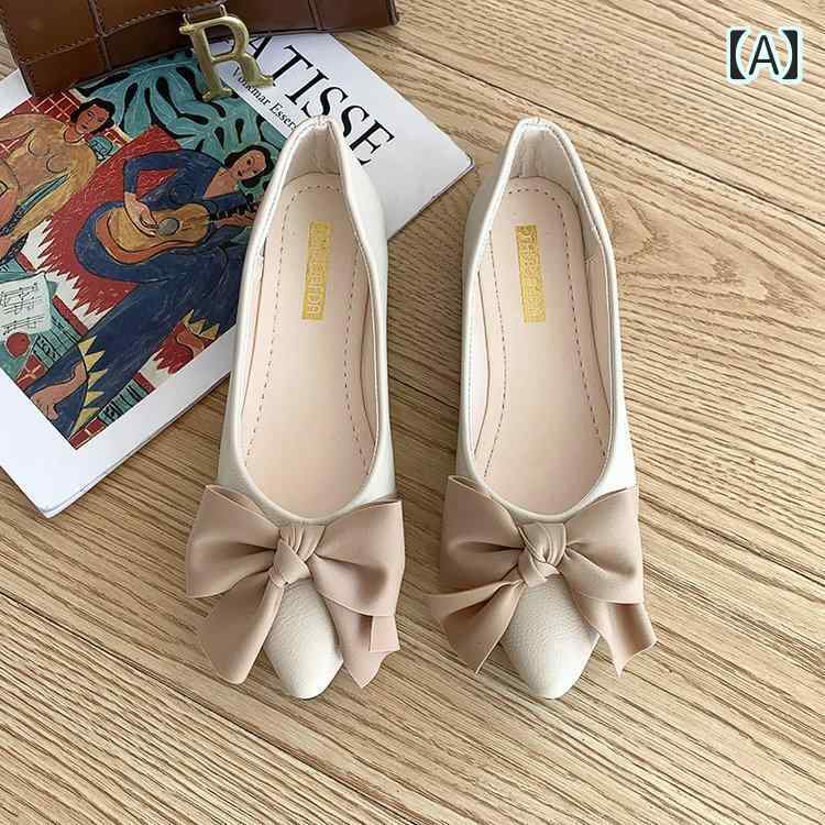 リボン パンプス バイカラー 大人可愛い レトロ ぺたんこ シューズ 韓国系 黒 白 ベージュ 無地 ヌーディー ビジネスシューズ レディース ポインテッドトゥ ローヒール 柔らかい ソフトレザー きれいめ パーティー 上品 定番 合皮 革靴 おしゃれ