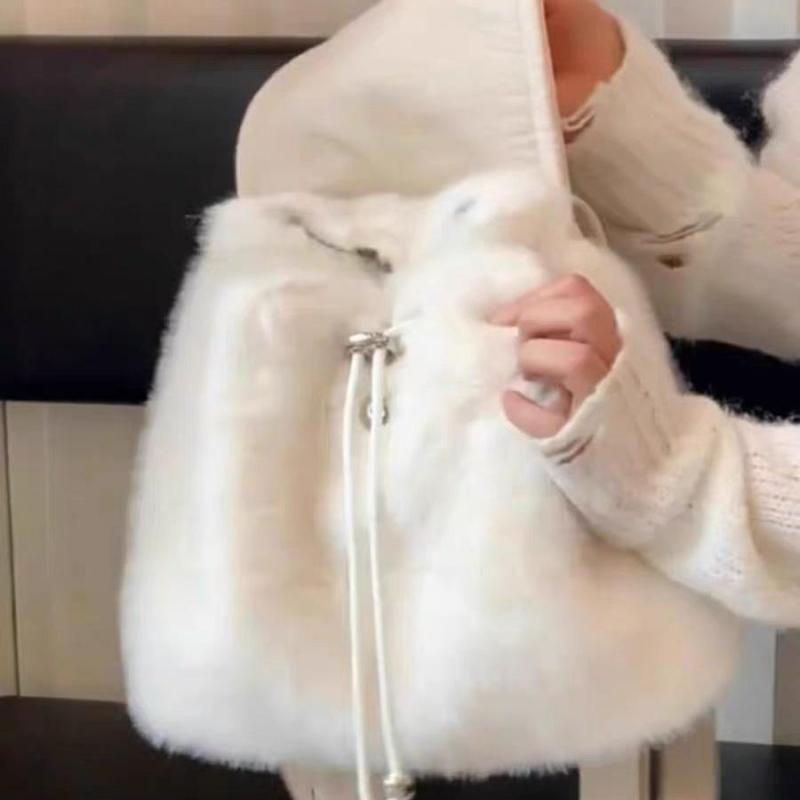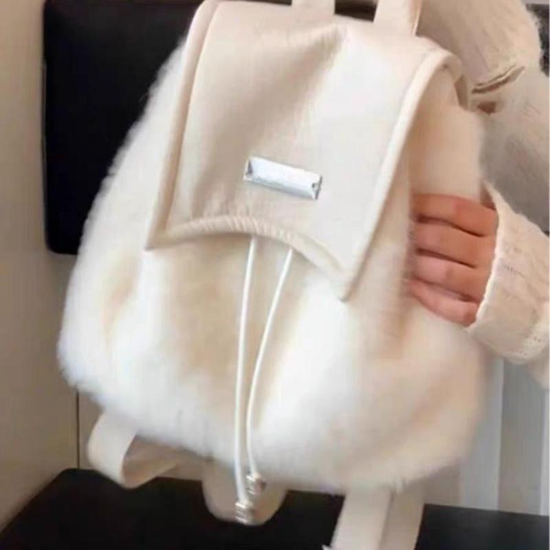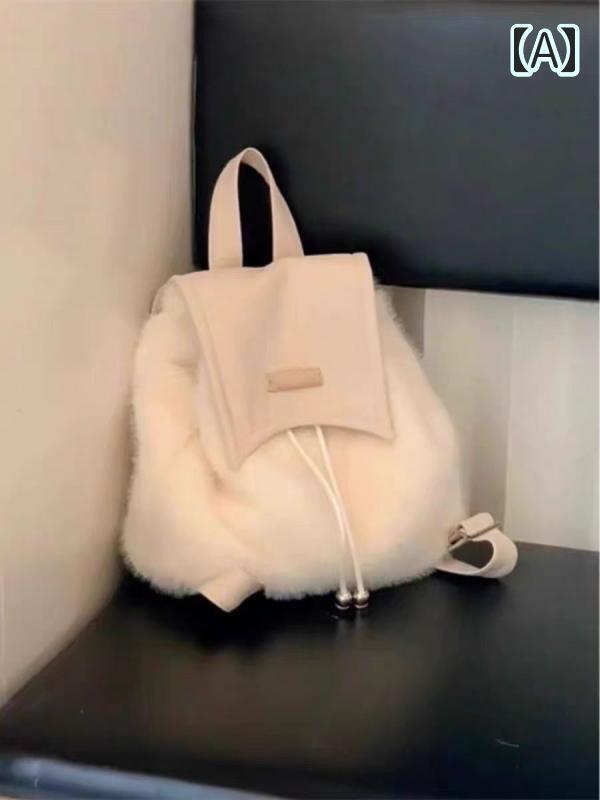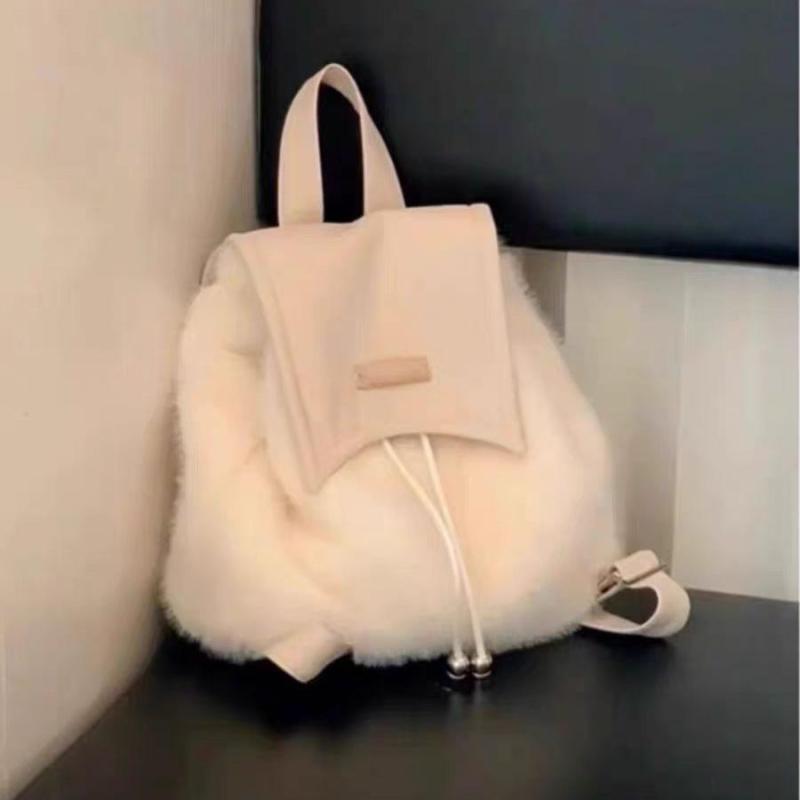 ファーリュック 白 ホワイト 可愛い もこもこ 毛皮風 リュックサック 韓国系 ガーリー ラブリー かぶせ 合皮 レザーバッグ 秋 冬 ふわふわ 異素材MIX 台形 丸い 個性的 バックパック 中学生 高校生 白バッグ 学校 スクールバック 上品 ラフ