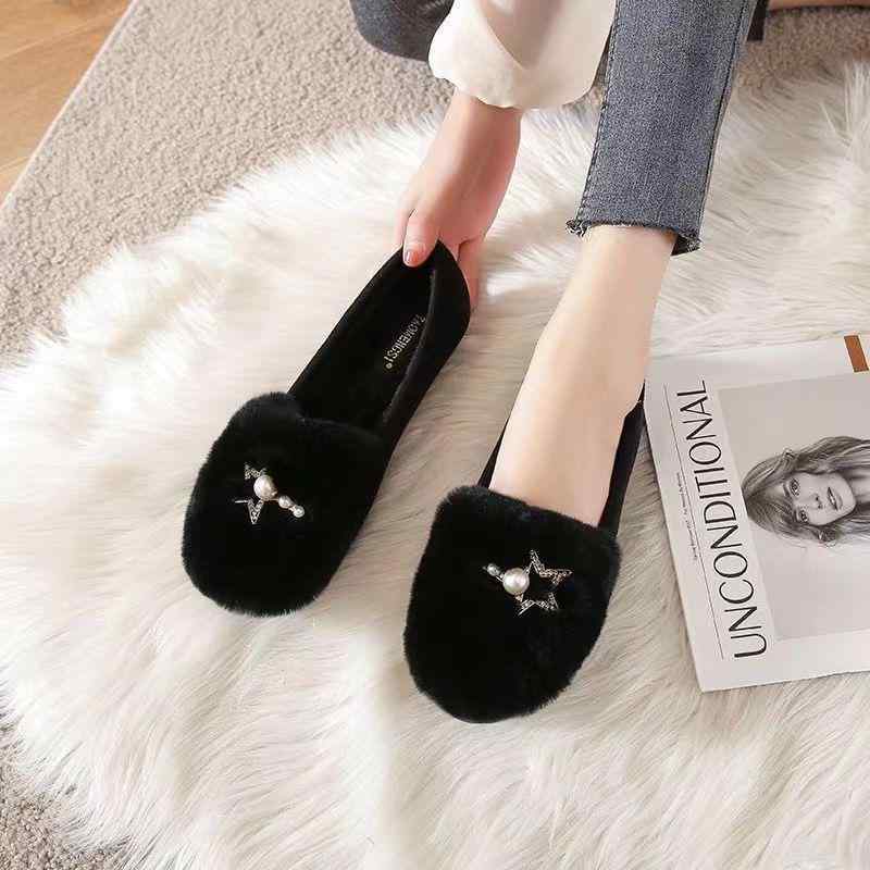 もこもこ スリッポン ファー パンプス ぺたんこ シューズ キラキラ クリスタル パール 星型 黒 グレー モコモコ 韓国系 個性的 スエード風 合皮 革靴 軽い 柔らかい スター型 ビジュー レディース 25.5 26cm フラット 履きやすい くつ