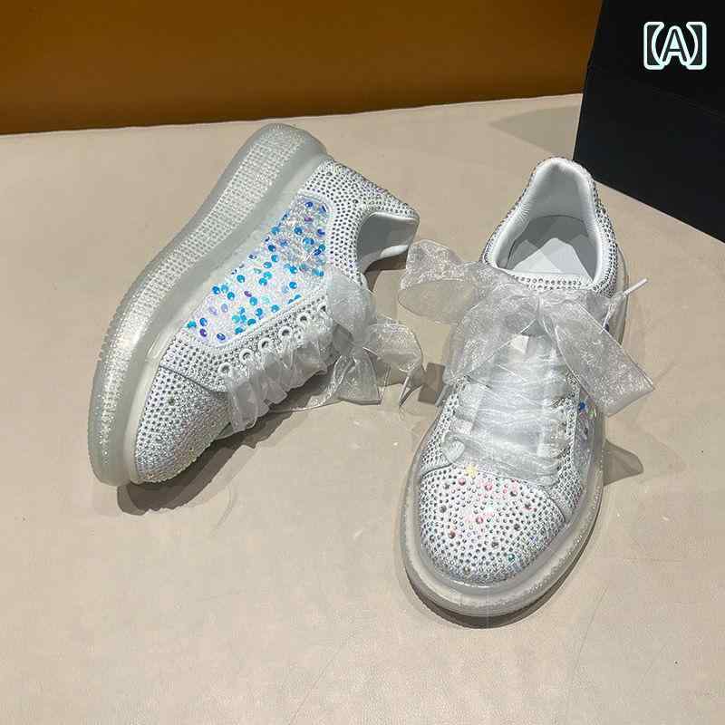 スニーカー キラキラ ラインストーン スパンコール 韓国系 厚底 シューズ 黒 白 ピンク グラデーション レース リボン 運動靴 淡色 ブラック ホワイト ビジュー クリスタル 全面 華やか 個性的 オルチャン系 インスタ映え レディース 学生
