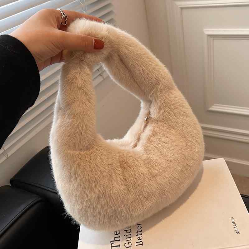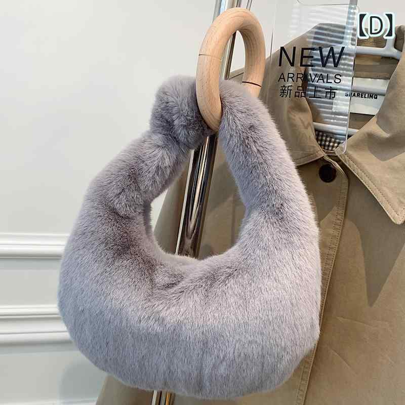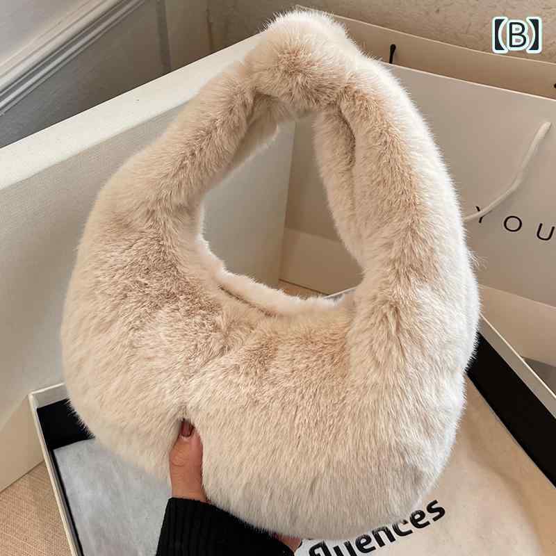 ハンドバッグ ファー もこもこ 三日月型 ミニバッグ 可愛い 韓国系 秋冬 レディース 手提げ 手持ち バック 毛皮風 黒 白 ベージュ カーキ グレー 無地 フェイクファー 個性的 映える ポータブル バケット バック ふわふわ エアリー きれいめ