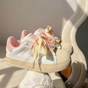 スニーカー 可愛い ポップ カラフル 韓国系 運動靴 レディース 厚底 イエロー ピンク グリーン パステル 紐デザイン アクセサリー ぽってり かわいい おしゃれ ポップ キュート アクセント 個性的 春カラー 淡色 ユニーク ダッドスニーカー 学生