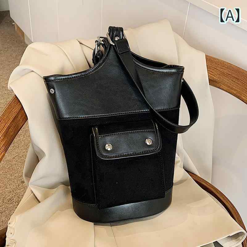 ショルダーバッグ スエード風 バイカラー クロスボディ おしゃれ 個性的 縦長 スクエア型 レザーバッグ 黒 ブラック 茶色 ブラウン 切り替えデザイン 異素材MIX 合皮 ソフトレザー バケット 斜め掛け 肩がけ ボディバッグ レディース かっこいい