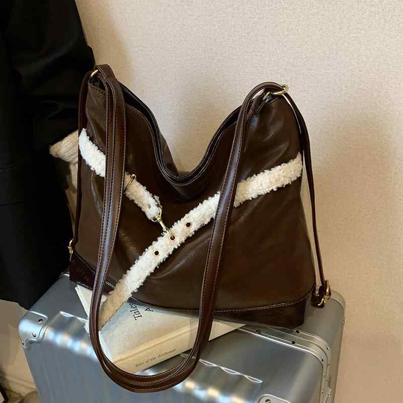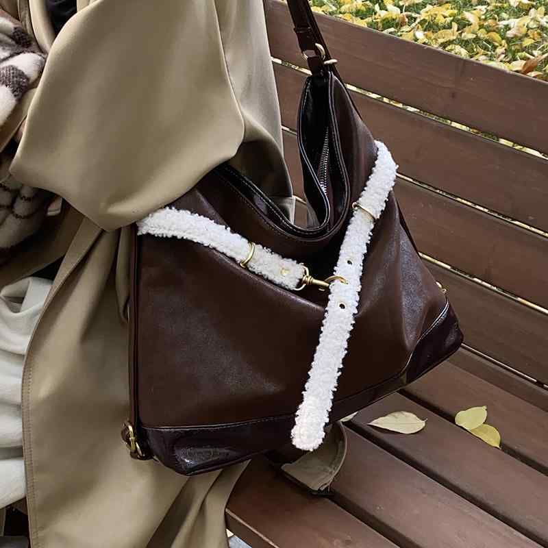 トートバッグ ボア 個性的 きれいめ ショルダーバッグ 大容量 A4 スクエア型 韓国系 茶色 バイカラー もこもこ 斜めがけ 肩がけ バック 合皮 レザーバッグ 通勤 ビジネス 通学 大学生 カバン ブラウン ダークカラー 異素材MIX 大人可愛い