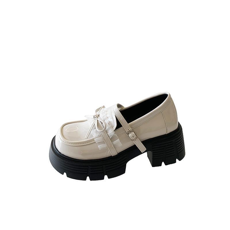 ローファー 厚底 リボン フリル 可愛い レザーシューズ 韓国系 レトロ 黒 ブラック ベージュ 学生 通学 学校 スクール 革靴 チャンキーヒール 個性的 ダブルベルト スクエアトゥ 光沢 エナメル風 量産型 オルチャン系 女子 脚長 コスプレ