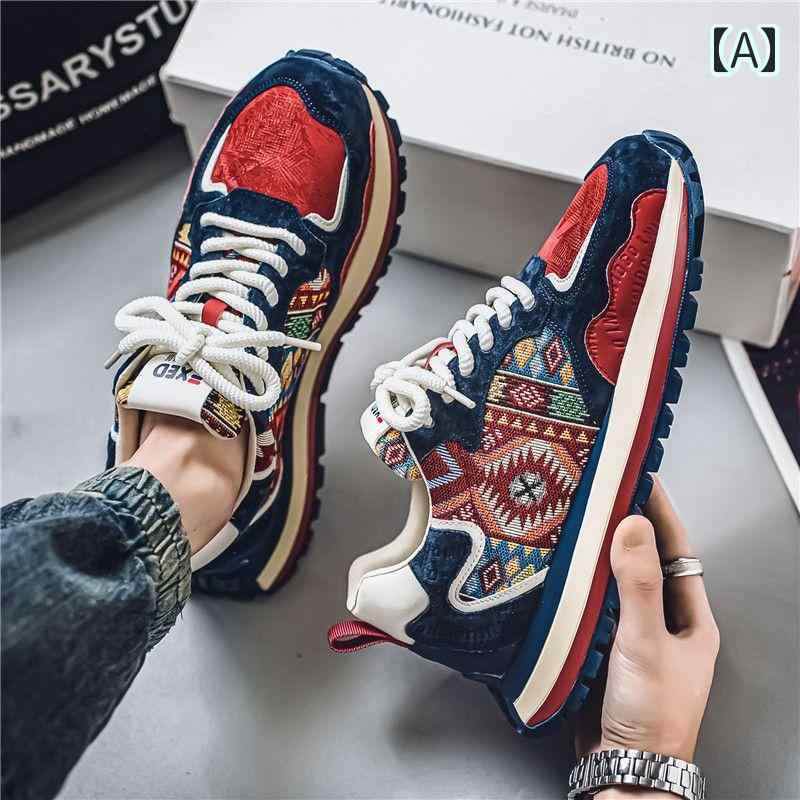 スニーカー メンズ おしゃれ ネイティブ柄 韓国系 個性的 運動靴 ダッドスニーカー 厚底 アジアン エスニック レッド ベージュ ブラック スエード風 切り替えデザイン ぽってり ハード ゴツ底 ゴツめ 個性的 学生 通学 可愛い ナチュラル カラフル