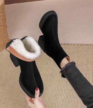 ブーティ スエード風 もこもこ 裏起毛 カジュアル ショートブーツ 韓国系 合皮 マット レザーブーツ 黒 ブラック 茶色 ブラウン 無地 アンクルブール 足首 ラウンドトゥ ファスナー 太ヒール 低ヒール 寒くない 防寒 シューズ レディース 秋 冬