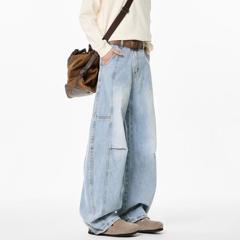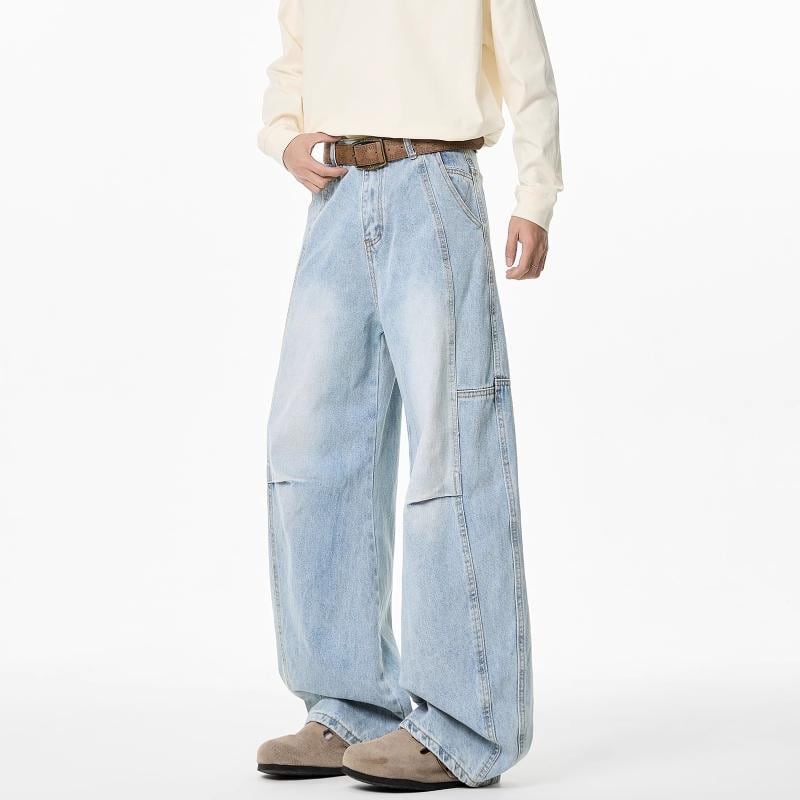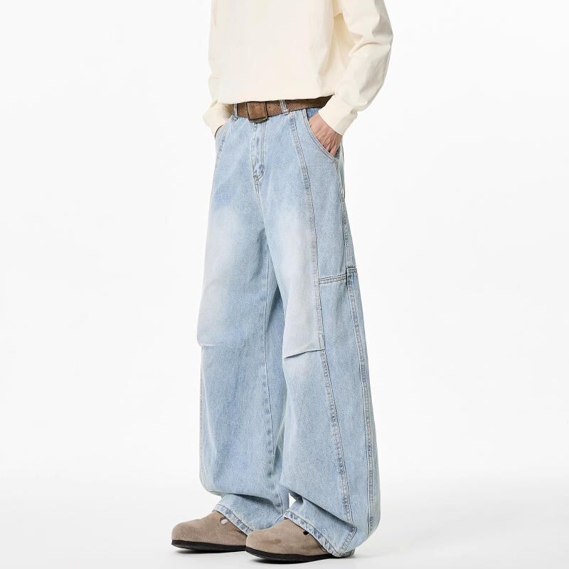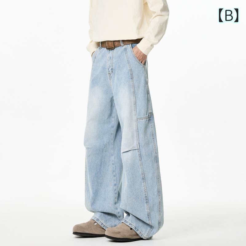ワイドデニム メンズ かっこいい 個性的 ジーンズ ズボン パンツ 男性用 切り替えデザイン 青 ブルー ライトブルー バナナパンツ 大きいサイズ ワイド ルーズ ストレート アメリカン ウォッシュ加工 脚長 水色 淡色 ジーパン 韓国系 カッコイイ
