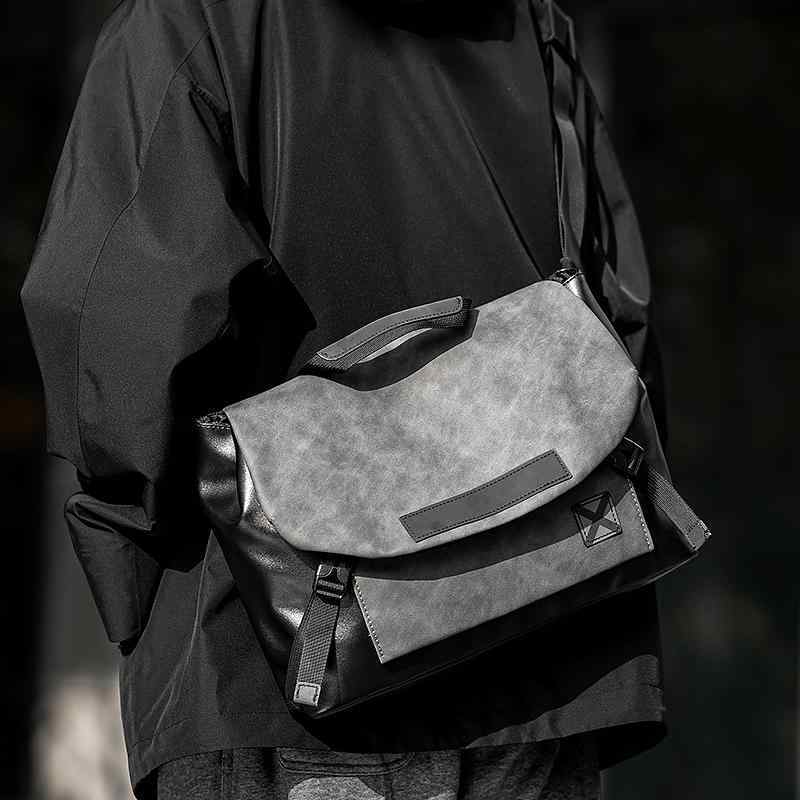ショルダーバッグ かっこいい 個性的 斜め掛け 通学バッグ 韓国系 メンズ 男性用 グレー ブラウン ベルトデザイン やポケット 仕切り 大容量 タブレット 機能性 灰色 茶色 バイカラー メッセンジャー ボディバック 学校 スクール 大学生 かばん