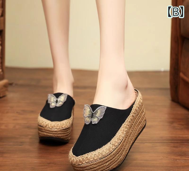 厚底 サボサンダル ミュール 蝶 ちょうちょ アジアン エスニック サンダル レトロ 刺繍 ウッディ 麦わら ストローソール レディース 春夏 シューズ 白 ホワイト 黒 ブラック ヒョウ柄 レオパード柄 バイカラー サマースリッポン ナチュラル ラフ