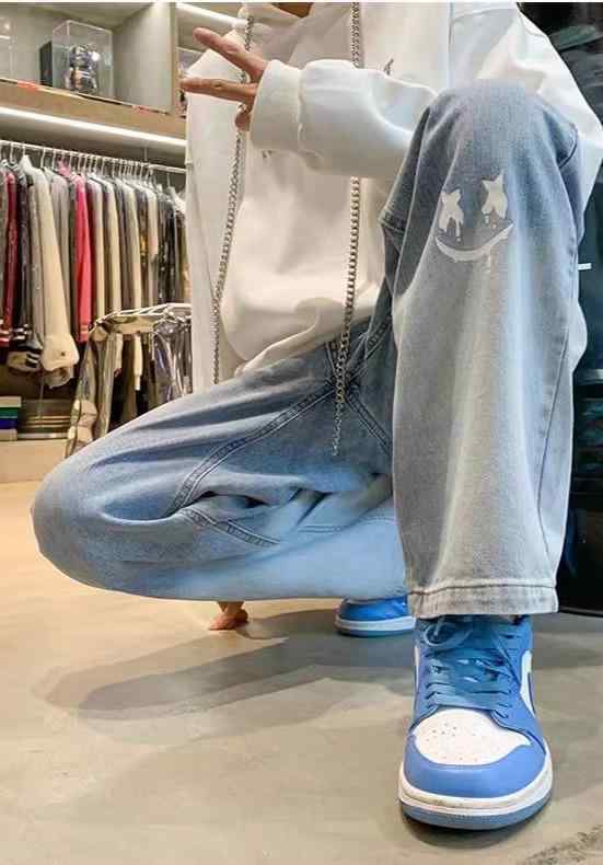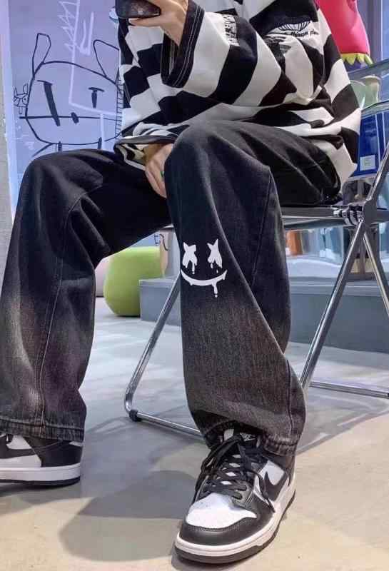 ジーンズ メンズ スマイル 星 個性的 デニムパンツ ズボン 韓国系 ジーパン 男性用 ブルー ブラック グラデーション スター柄 淡色 水色 黒 大きいサイズ ワイド ルーズ ストレート アメリカン ウォッシャブル キャラクター 個性的 可愛い 学生