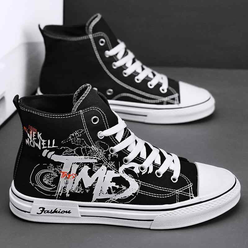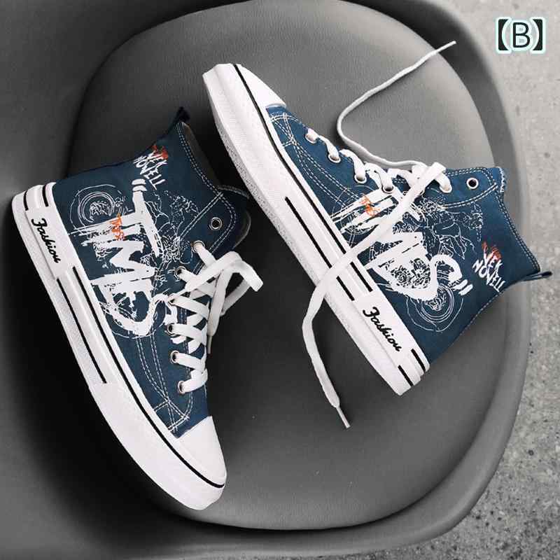 ハイカットスニーカー 個性的 カラフル ポップ キャンバス シューズ 韓国系 メンズ カッコイイ 運動靴 男性用 黒 白 青 バイカラー 落書き風 ブラック ブルー ホワイト グラフィック柄 帆布 シューズ フラット カジュアル 個性派 ユニーク 高見え