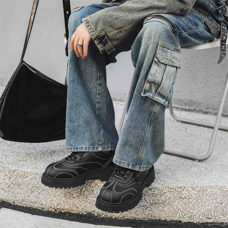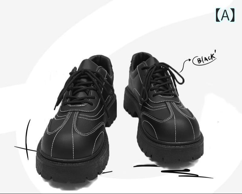 スニーカー ローファー メンズ かっこいい 個性的 黒 レザースニーカー 韓国系 ステッチ ユニーク 運動靴 メンズ 厚底 ローカット ブラック ぽってり 丸み ストリート カジュアル 光沢 レザー 革靴 フォーマル ロック 印象的 個性派 ロック 学生