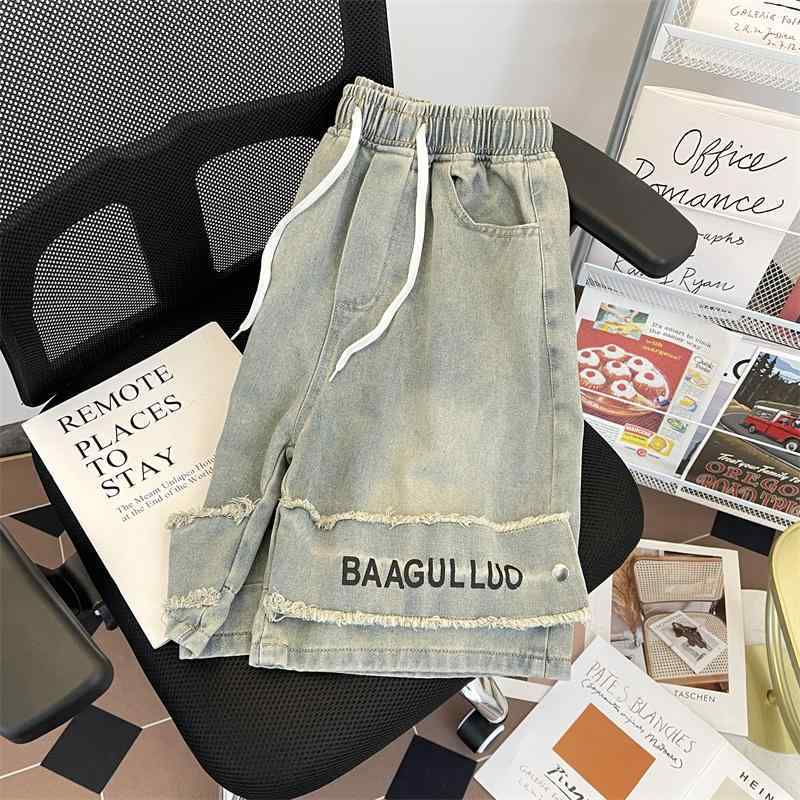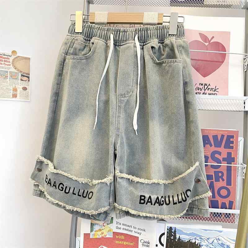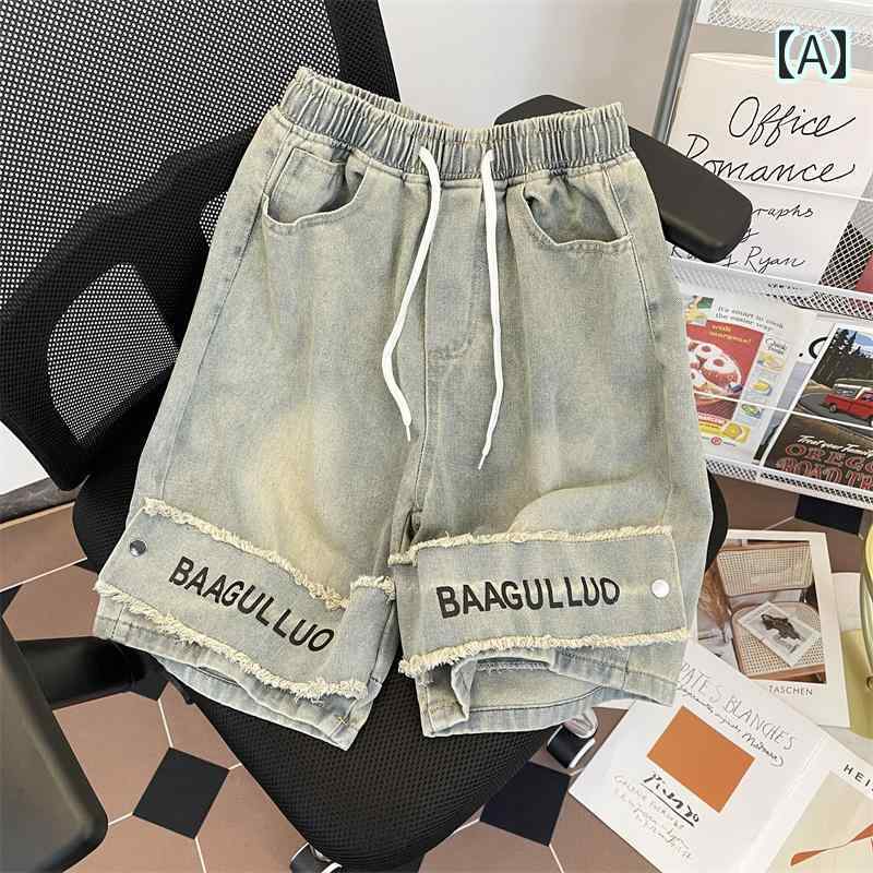 ハーフパンツ ショートパンツ 韓国系 メンズ 個性的 英文字 ロゴ ワイド 淡色 水色 ズボン ジーンズ 男性用 ブルー ウエストゴム フリンジタグ 大きいサイズ ルーズ ウォッシュ加工 可愛い 幼い 春夏 ジーパン ワイドレッグ 韓国男子 学生