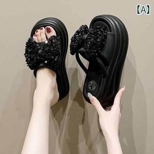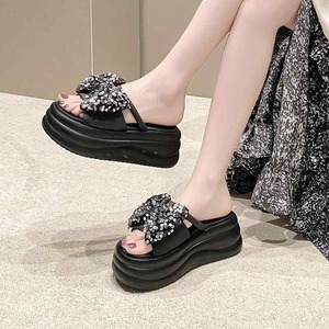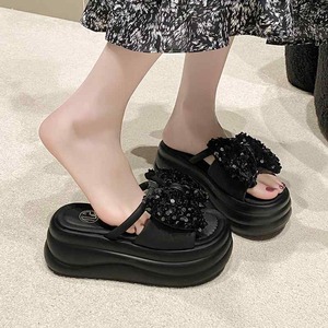 スパンコール スリッパ サンダル 7.5cm 厚底 ハイヒール ビーチサンダル レディース キラキラ 個性的 リボン 黒 ブラック 銀色 シルバー 華やか 可愛い プラットフォーム シューズ 春夏 ビーサン 脚長 身長アップ 韓国風 オルチャン クラブ