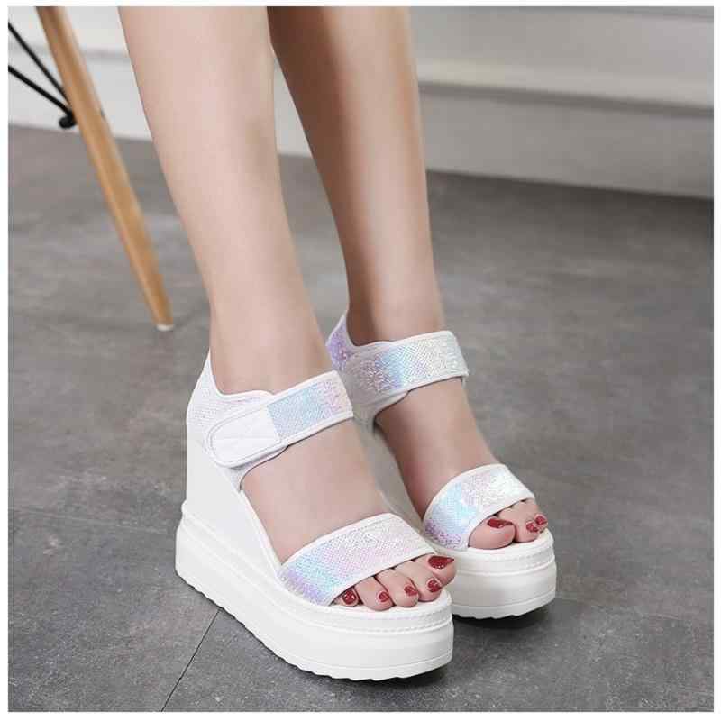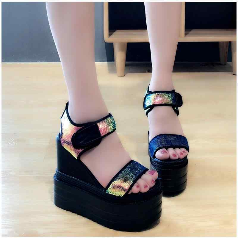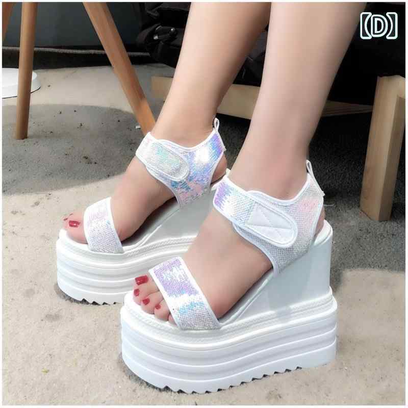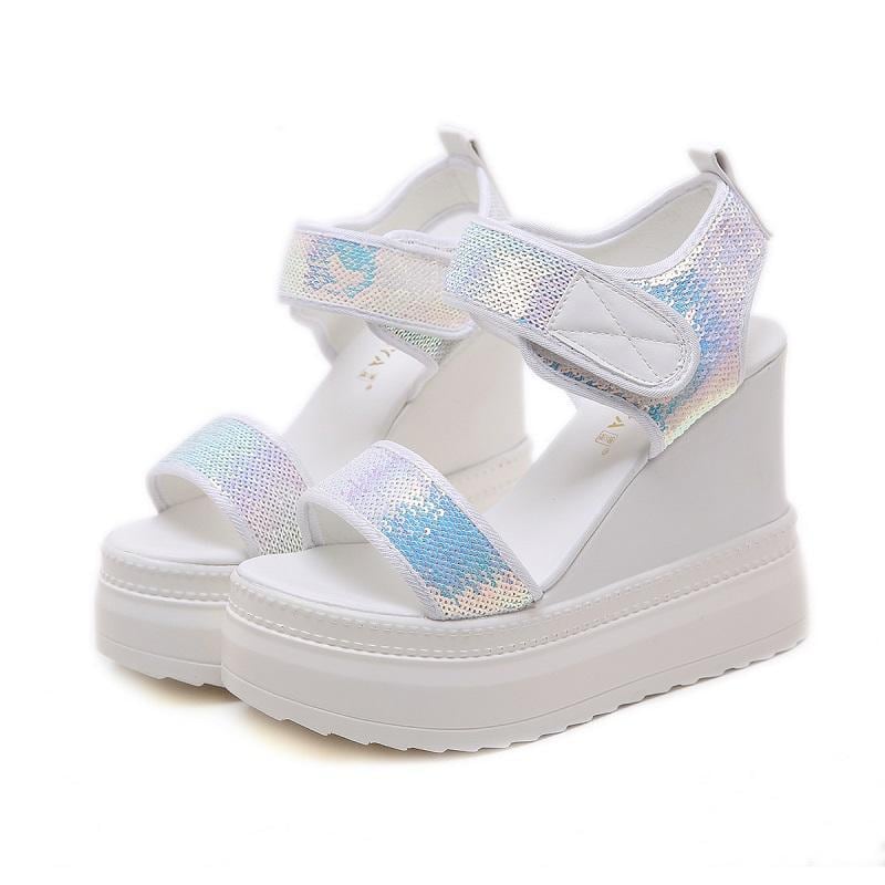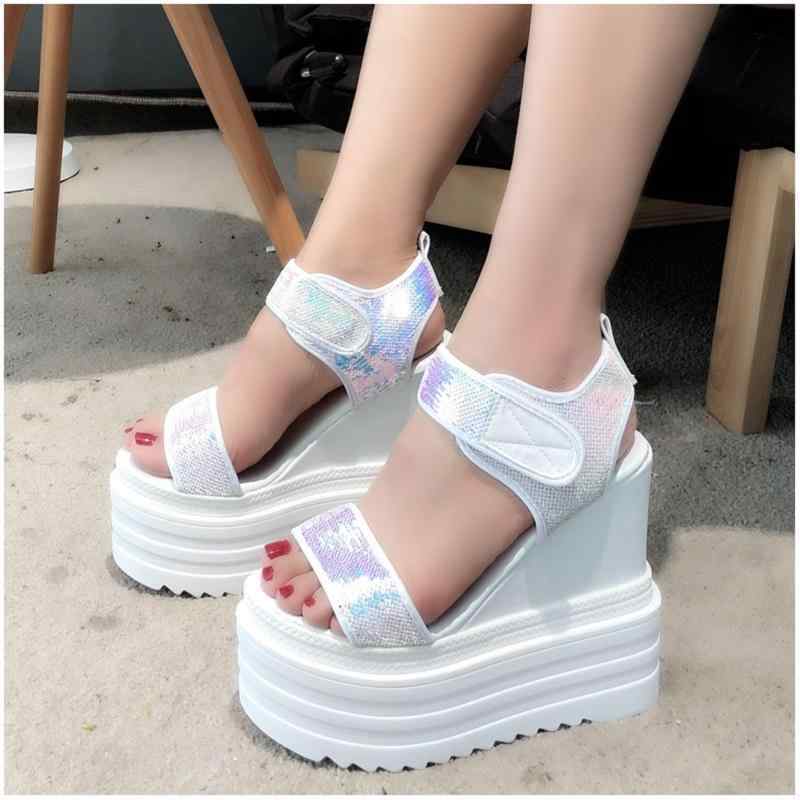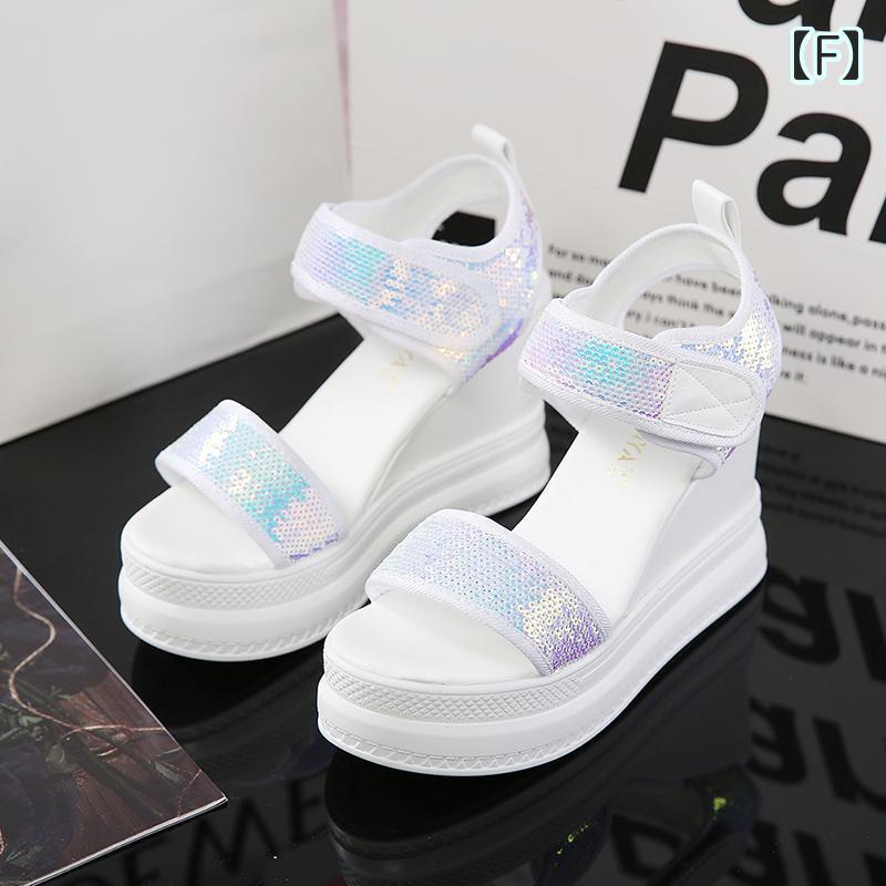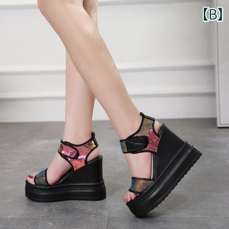 スポサン ウエッジソール 黒 白 スパンコール サンダル 厚底 プラットフォーム シューズ 身長アップ 脚長 レディース スポーツサンダル キラキラ 個性的 韓国系 華やか 春夏 ウェディング 結婚式 花嫁 スーパー ハイヒール 14cm 12cm