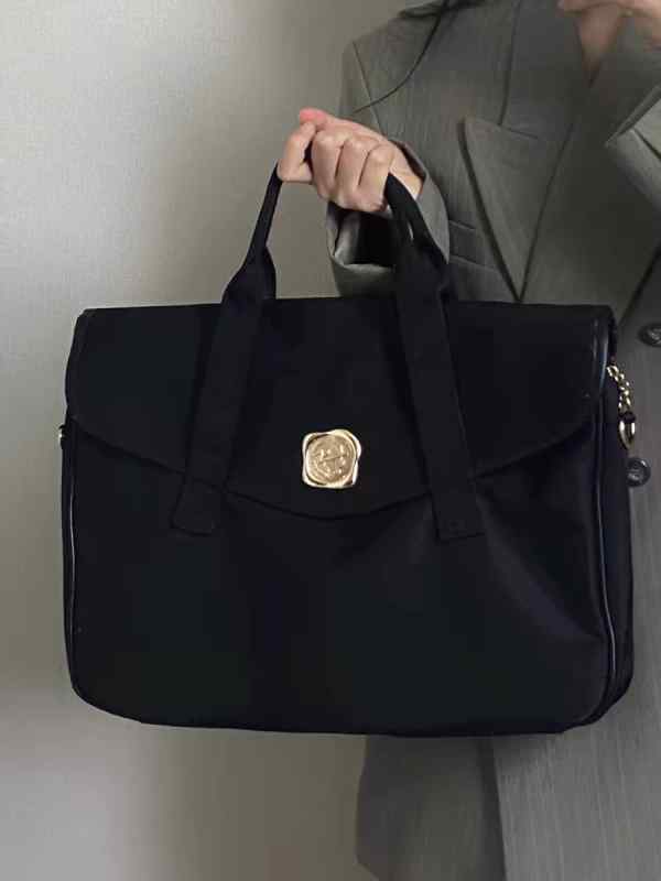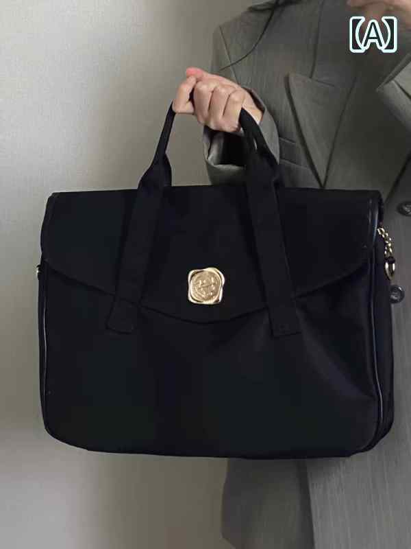 ビジネスバッグ トートバッグ 黒 大人可愛い スクエア型 レディース 大容量 A4 2way ショルダーバッグ ブラック 無地 通学 学校 スクールバッグ 通勤 仕事 バック かっこいい 個性的 金ボタン PCバック おしゃれ 大人 フォーマル ナイロン