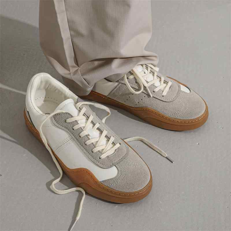 スニーカー おしゃれ ナチュラル レザースニーカー メンズ レディース 運動靴 レースアップ スエード バイカラー レトロ 白 灰色 ホワイト グレー 個性的 きれいめ こなれ感 ラウンドトゥ アンニュイ ニュアンスカラー 韓国系 個性派 SNS 映える