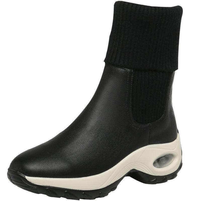 ソックス ブーツ 大人可愛い 個性的 レディース ミドルブーツ 黒 白 エアクッション 韓国系 リブニット 靴下生地 折り返し 異素材ミックス レザーブーツ スニーカー 本革 牛革 高級感 セレブ モノトーン 厚底 疲れにくい インスタ映え 抜け感