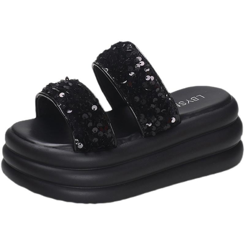 7cm 厚底 サンダル ビーチサンダル ラインストーン おしゃれ 大人可愛い プラットフォーム 春夏 シューズ オルチャン系 量産型 スポーツサンダル ストラップ無 ベルト 黒 ブラック 銀色 シルバー バイカラー メタリック きらきら 輝く 面白い