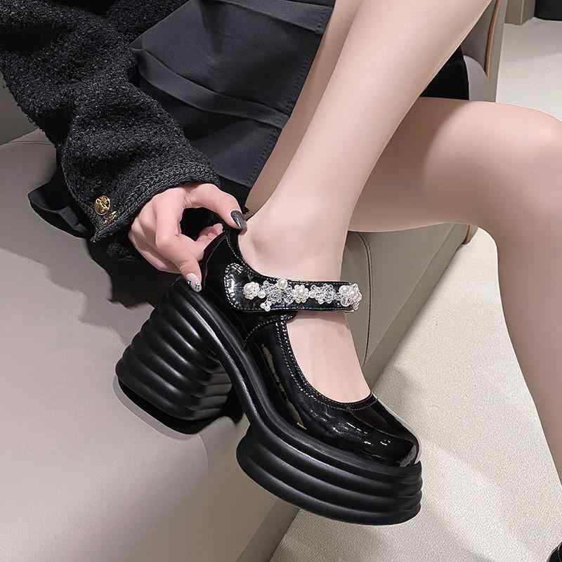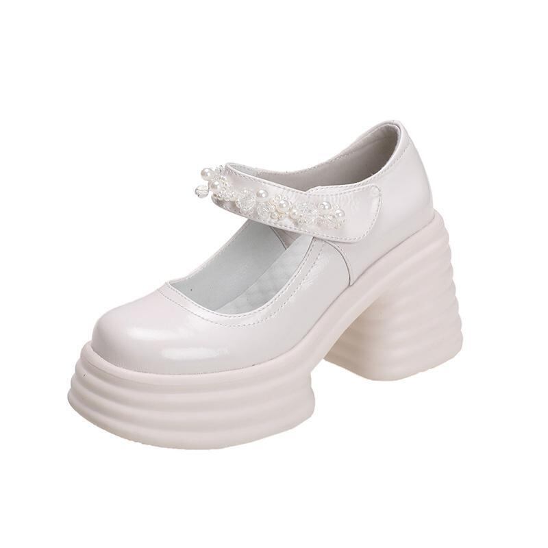 8cm 超厚底 ローファー パンプス フレンチレトロ 可愛い ガーリー ロリータ お嬢様 コスプレ 革靴 レディース 黒 白 光沢 エナメル風 レザーシューズ 太ヒール チャンキーヒール キラキラ パール ビーズ 個性的 プリンセス 姫系 量産型 女の子