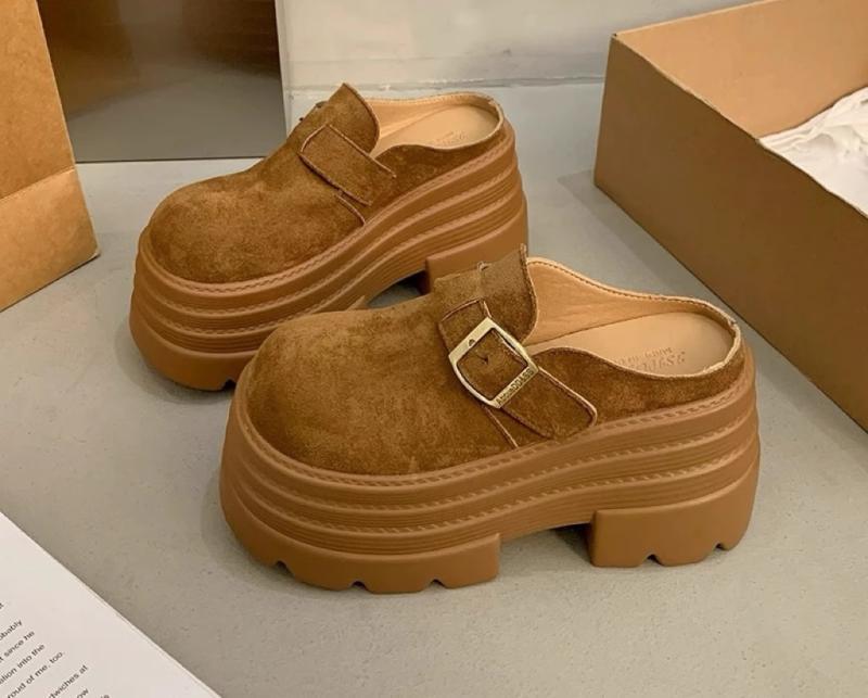 8cm 厚底 サボサンダル スエード レトロ 可愛い つっかけ スリッポン サンダル 黒 ブラック 茶色 ブラウン ベルト バックル レディース 春夏 秋 シューズ 韓国系 ぽってり 丸み かわいい フレンチ ナチュラル レザーシューズ キュート