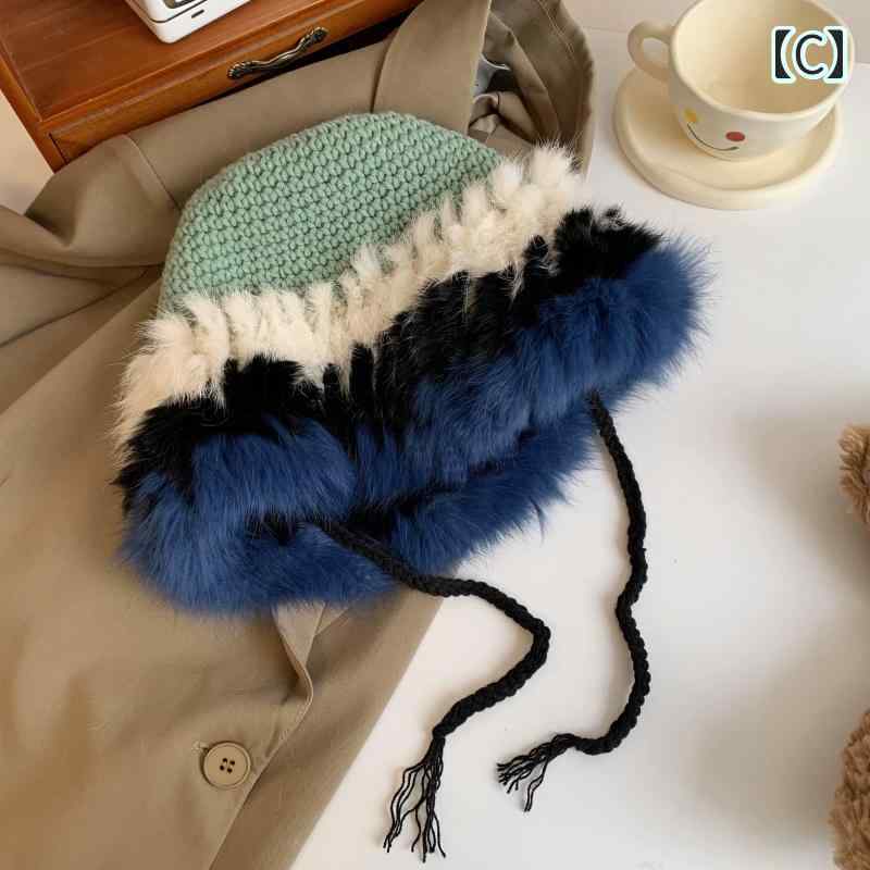 ニット帽 レディース もこもこ ファー 帽子 女性 秋 冬 ブルー 青 暖かい ハット キャップ バイカラー かわいい 可愛い 20代 30代 40代 カジュアル 防寒 防風 お出かけ デート 誕生日 プレゼント 学生 通学 ぬいぐるみ 着ぐるみ 韓国