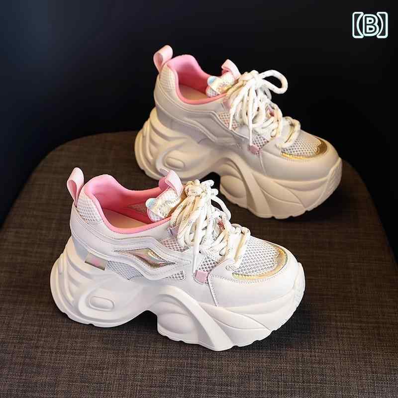 超厚底 8cm スニーカー カラフル 韓国系 可愛い ポップ 運動靴 レディース ダッドスニーカー グリーン ピンク ホワイト カラフル メッシュ ゴツい ハイテクスニーカー オルチャン 女子 個性的 POP 目立つ 映える 身長アップ 高ヒール 学生