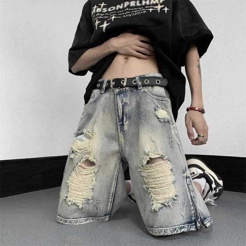 ハーフパンツ デニム 短パン メンズ 韓国系 ロック ワイド ジーンズ ズボン 男性用 ブルー 青 ダメージ加工 裾ファスナー 穴あき 大きいサイズ ルーズ アメリカン ウォッシュ加工 水色 淡色 個性的 ビンテージ風 ユーズド風 かっこいい 韓国男子