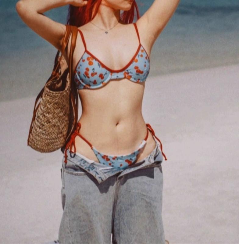 ビキニ チェリー柄 さくらんぼ レトロ 可愛い 紐ビキニ 韓国系 レディース 水着 青 赤 ブルー レッド パイピング ワイヤーカップ 上下セット セパレート 三角ビキニ ポップ キュート 個性的 ユニーク 果物 フルーツ柄 バイカラー セクシー 学生