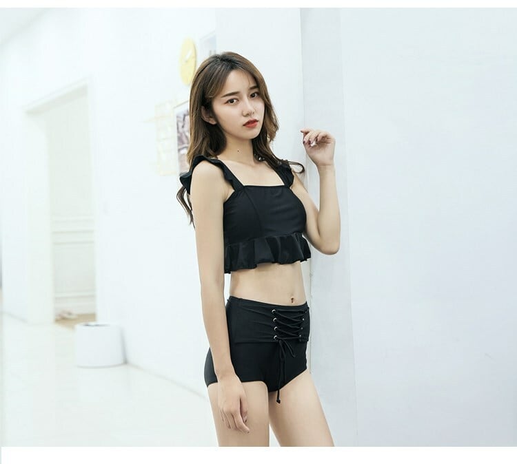水着 タンキニ ビキニ 編み上げ 体型カバー フリル レースアップ フェミニン 大人可愛い リゾート プール 海 バカンス ハイウエスト ブラック db0011