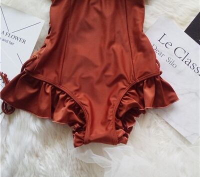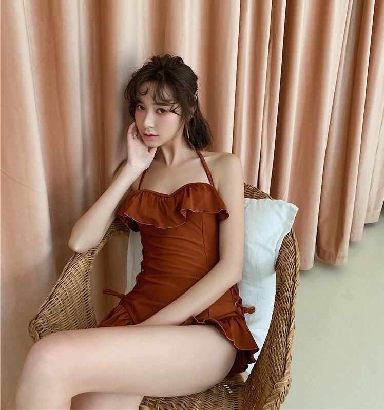 水着 ワンピース フリル バックコンシャス シンプル 上品 エレガント 大人 レースアップ ブラウン 大きいサイズ 着痩せ リゾート プール 海 バカンス db0045
