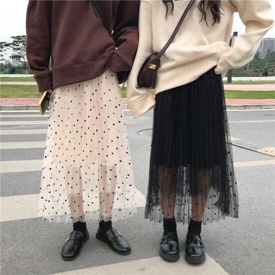 プリーツスカート プリーツ スカート 膝丈レディース ファッション スカート ボトムス 大きいサイズ ゆったり チュール ドット 水玉 春スカート 春 韓国 ファッション レディース 新作 st0659