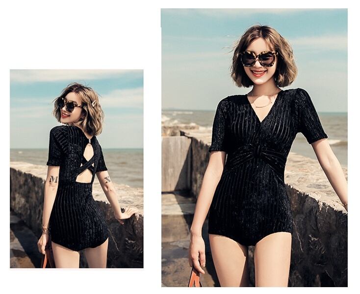 水着 レトロ ワンピース 半袖 ギャザー コンサバ Vネック 夏 肌見せ リゾート 大人 上品 バックコンシャス 無地 db0132