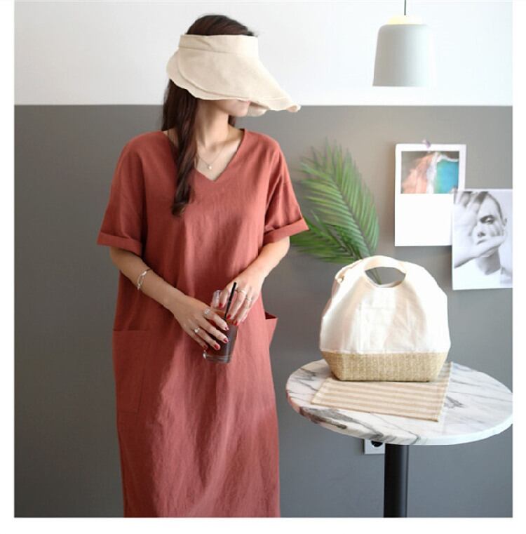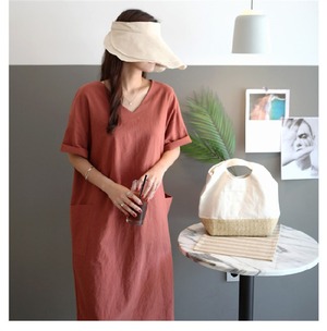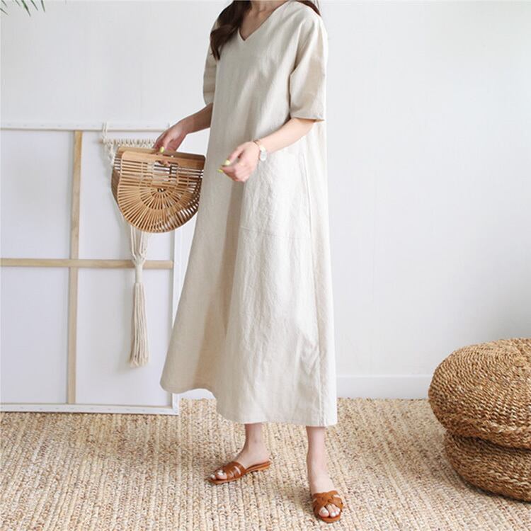 ワンピース Vネック 半袖 ロング マタニティ リネン ゆったり 涼しい 夏 ロングワンピース マキシワンピース シンプル リラックス 大きいサイズ トレンド カジュアル db0137