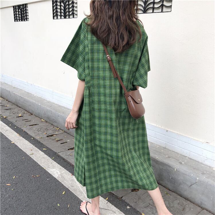 ワンピース 半袖 ロング チェック柄 ゆったり 大きいサイズ 夏 グリーン ラウンドネック カジュアル リゾート 夏 db0140