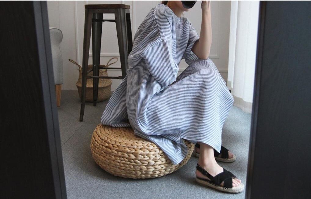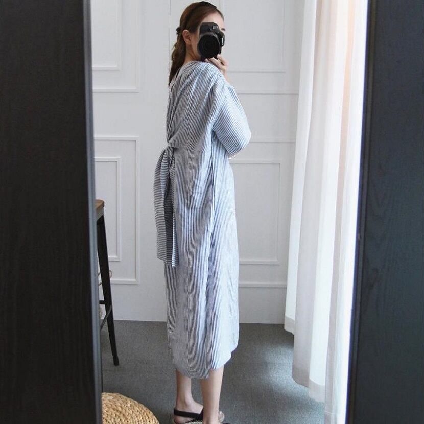 ワンピース リネン シャツワンピース カジュアルワンピース ストライプ バックリボン カジュアル 可愛い バックコンシャス ミモレ丈 スリット 七分袖 夏 カジュアル 新作 トレンド リラックス 重ね着 db0149