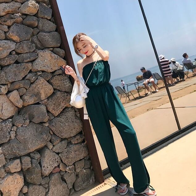 ジャンプスーツ パンツ チューブトップ オフショルダー スリット ハイウエスト リゾート ビーチ セレブカジュアル 夏 db0156