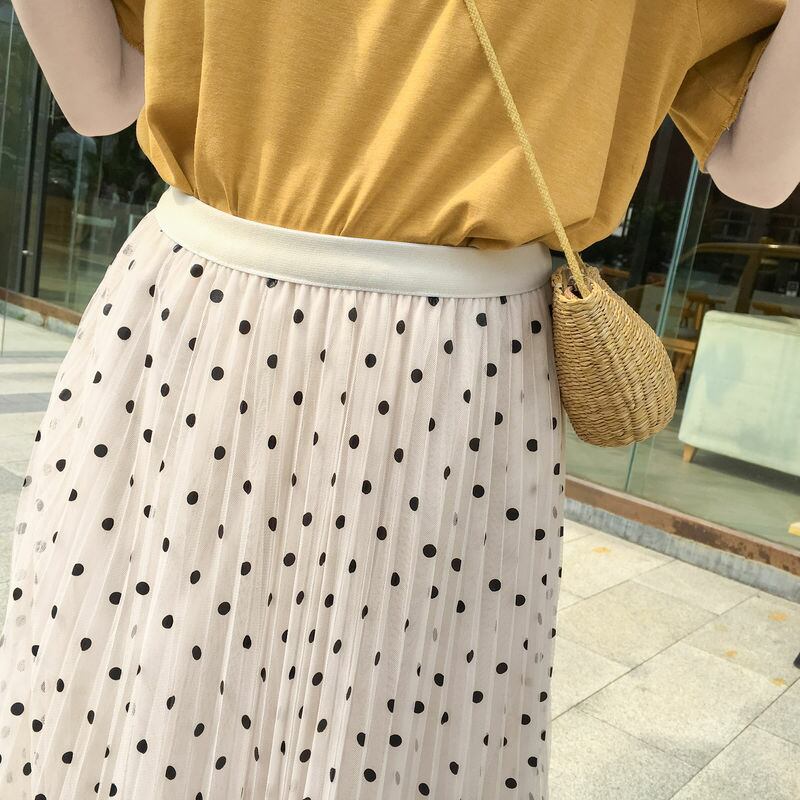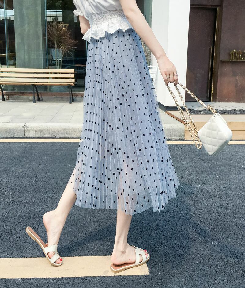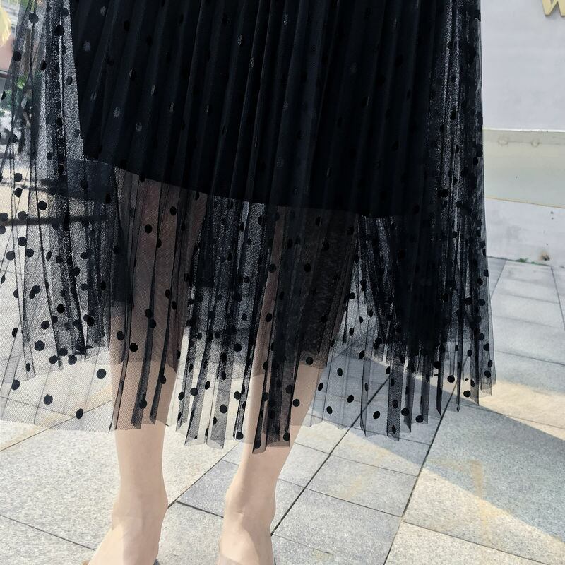 スカート プリーツ ミモレ ロング フレア ドット 水玉 ハイウエスト シフォン 春 夏 Aライン 大人 レトロ ゆったり 楽チン 通勤 新作 db0163