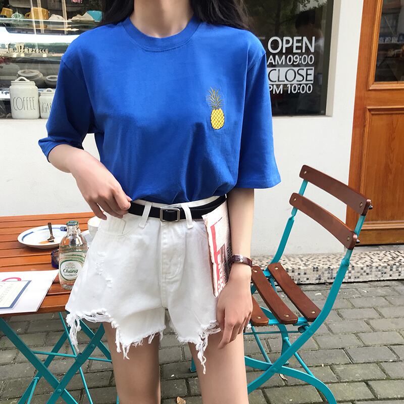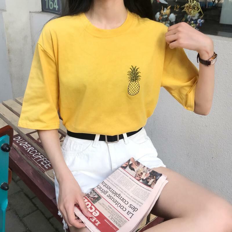 Tシャツ レディース トップス 半袖tシャツ オーバーサイズ ビッグサイズ パイナップル ドロップショルダー アプリコット 白 黒 パープル ブルー イエロー 刺繍 柄 カジュアル 可愛い 夏 半袖 db0186