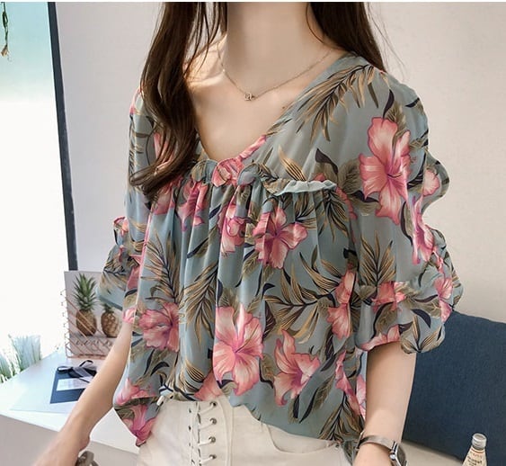 トップス レディース シャツ ブラウス オフショルダー 大きいサイズ 2l 3l 4l ゆったり 可愛い 肩出し トップス 花柄 半袖 シフォン ボタニカル 体型カバー 着痩せ 細見え リゾート 韓国 ファッション フリル 楽チン 春 夏 db0196