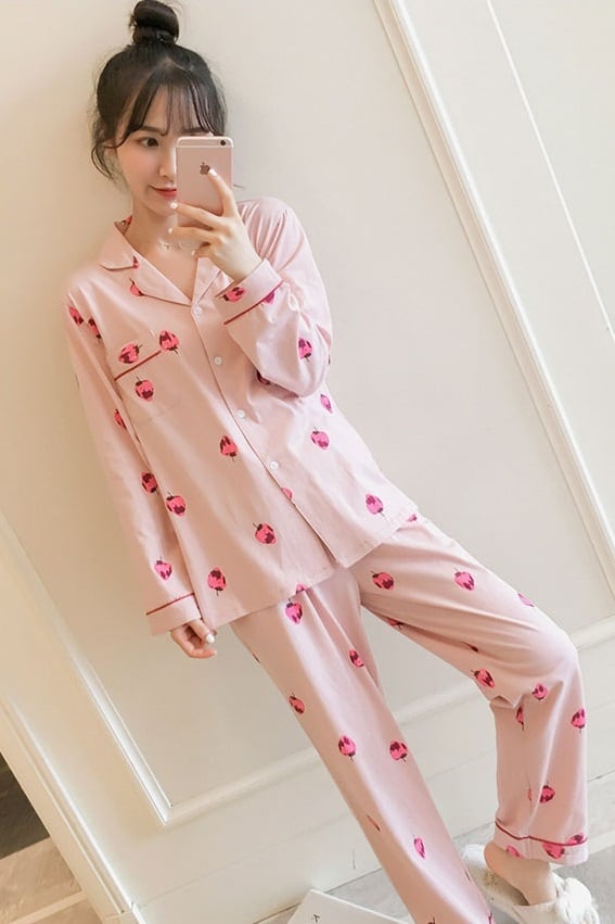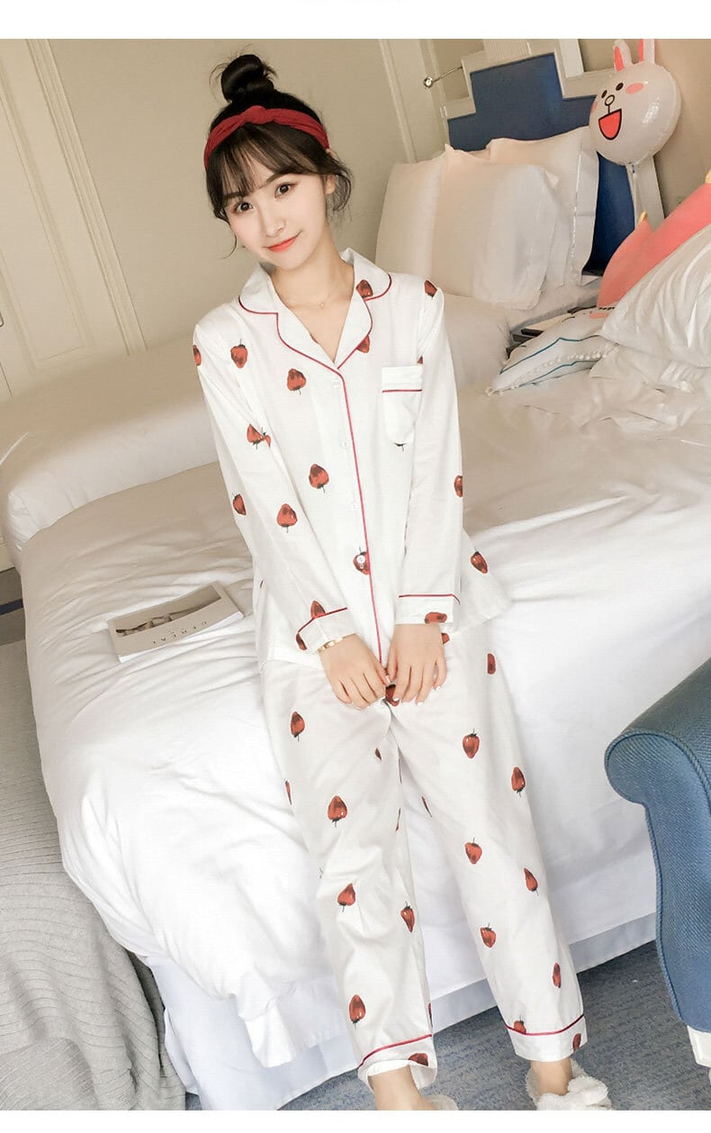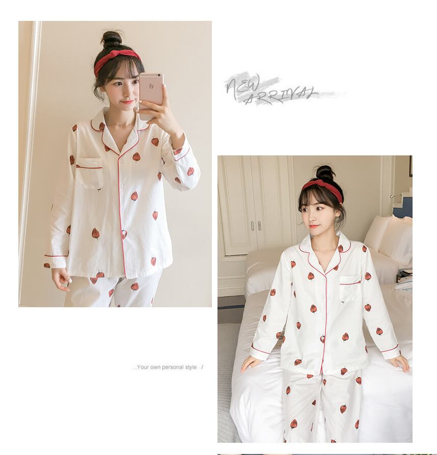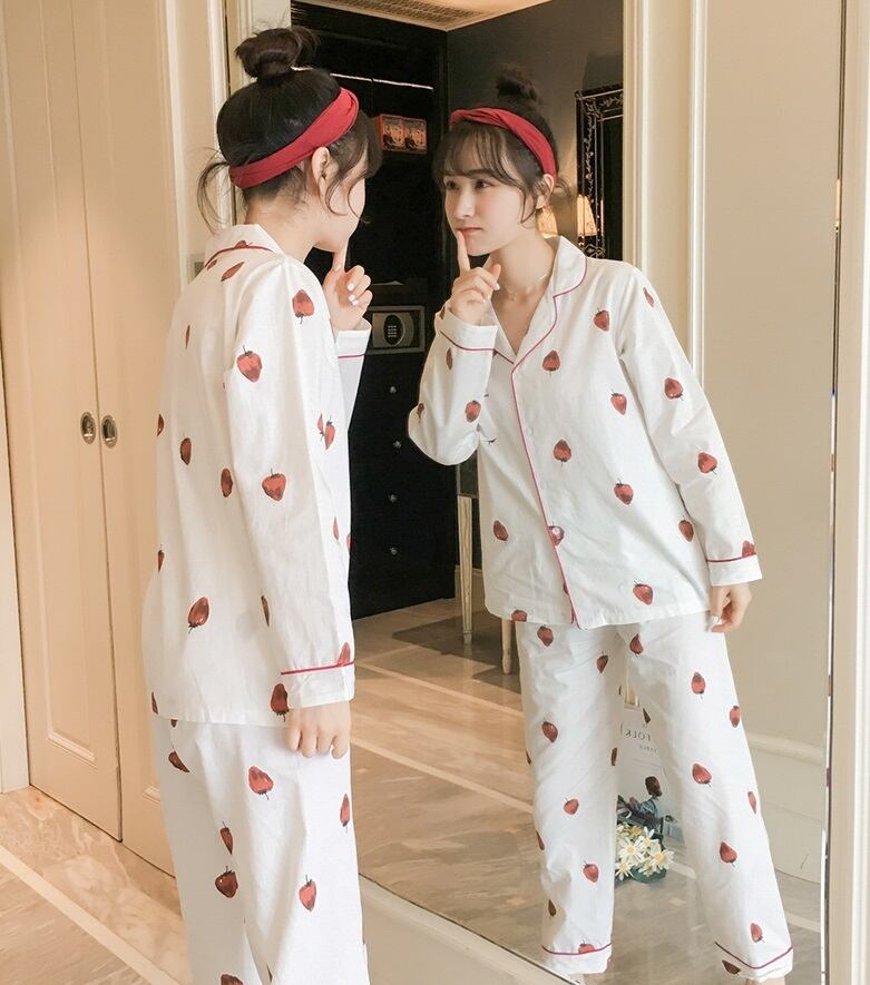 パジャマ ルームウェア 部屋着 レディース 上下 セット 春 夏 秋 長袖 前開き 大きいサイズ ストロベリー ラブリー いちご おしゃれ 可愛い 襟 ツーピース 白 ホワイト ピンク 長袖 ナイトウェア 寝巻き パンツ レディース 10代 20代 韓国 人気 新作 安い db0303