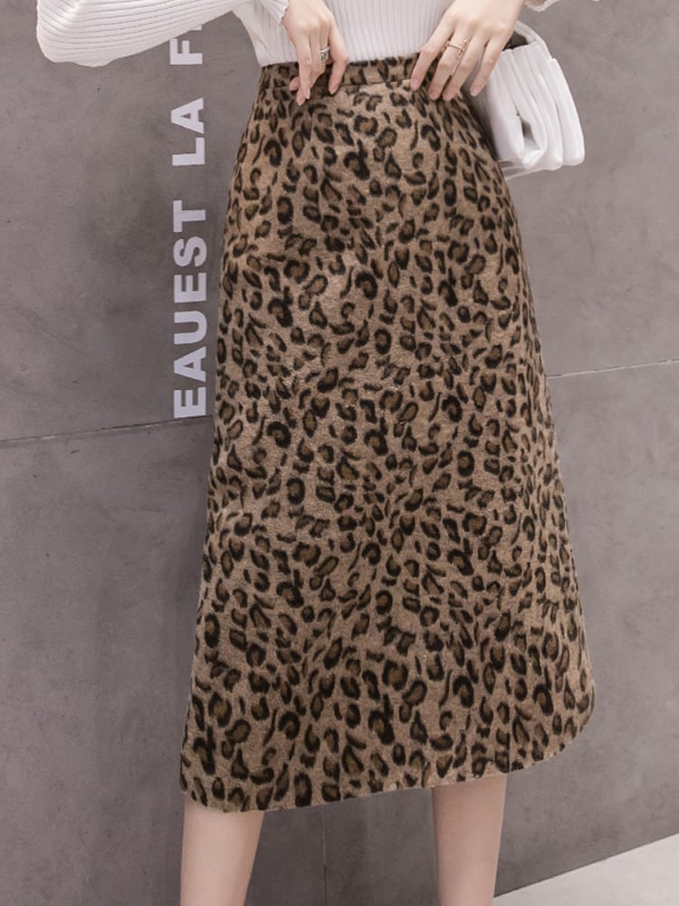 ヒョウ柄スカート ミモレ丈スカート スカート ボトムス レディース きれいめ 秋 冬 Aライン ハイウエスト ミモレ丈 膝丈 ヒョウ柄 レオパード柄 ブラウン 黒 グレー セクシー カジュアル ウール 通勤 通学 学生 OL デート 10代 20代 30代 美脚 新作 韓国 db0385