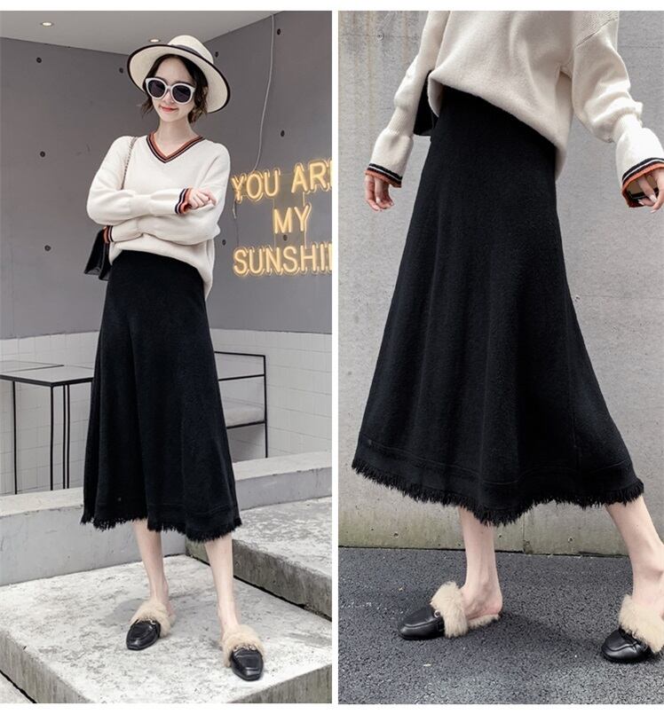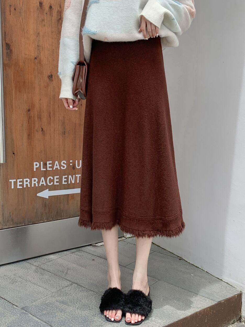 ニットスカート ミモレ丈スカート スカート ボトムス レディース 秋 冬 きれいめ Aライン ハイウエスト ミモレ丈 ロング ニット プリーツ 黒 ブラウン アプリコット リブ 無地 シンプル フレア カジュアル ウール ウエストゴム ゆったり 楽ちん 通勤 通学 学生 OL デート フリンジ 10代 20代 30代 美脚 新作 韓国 大きいサイズ db0388