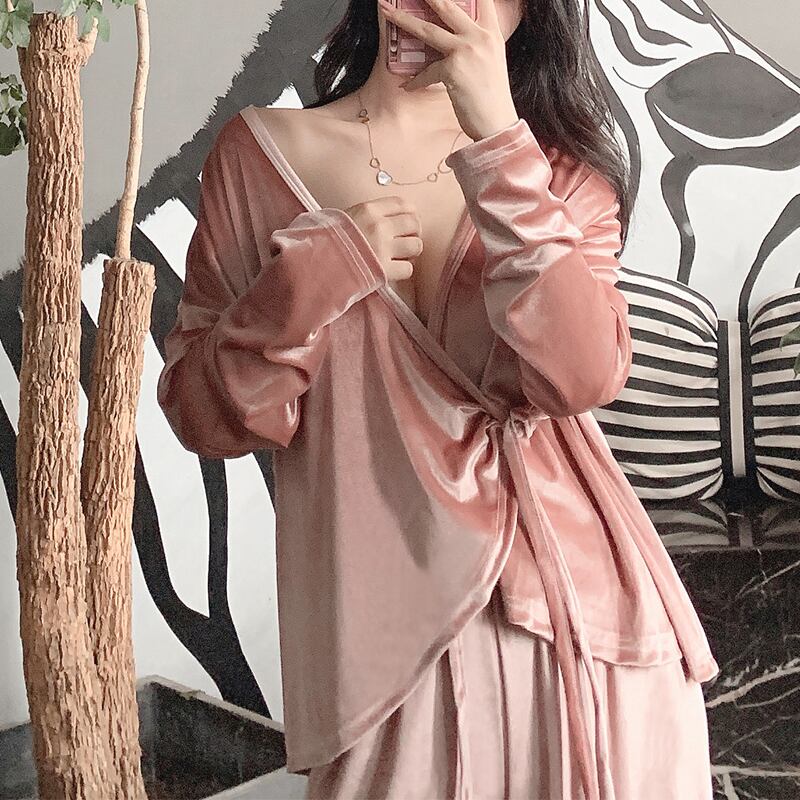 パジャマ レディース ルームウェア 部屋着 寝巻き ネグリジェ 上下セット 秋 冬 きれいめ セクシー 2点セット カーディガン パンツ ベルベット 長袖 前開き Vネック キャミソール 無地 ホームウェア デート お泊り会 シンプル 10代 20代 30代 緑 ネイビー ピンク 大きいサイズ xl 韓国 2019 新作 人気 安い db0495
