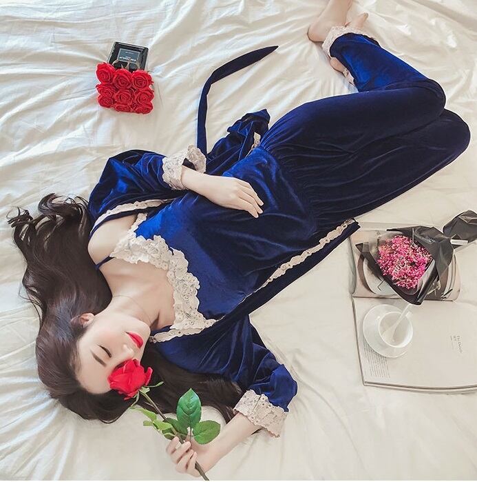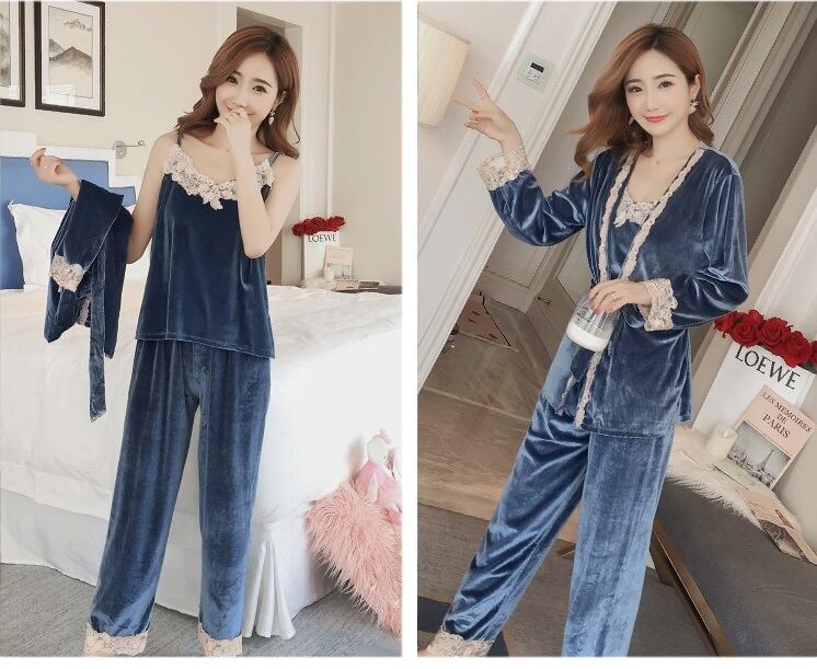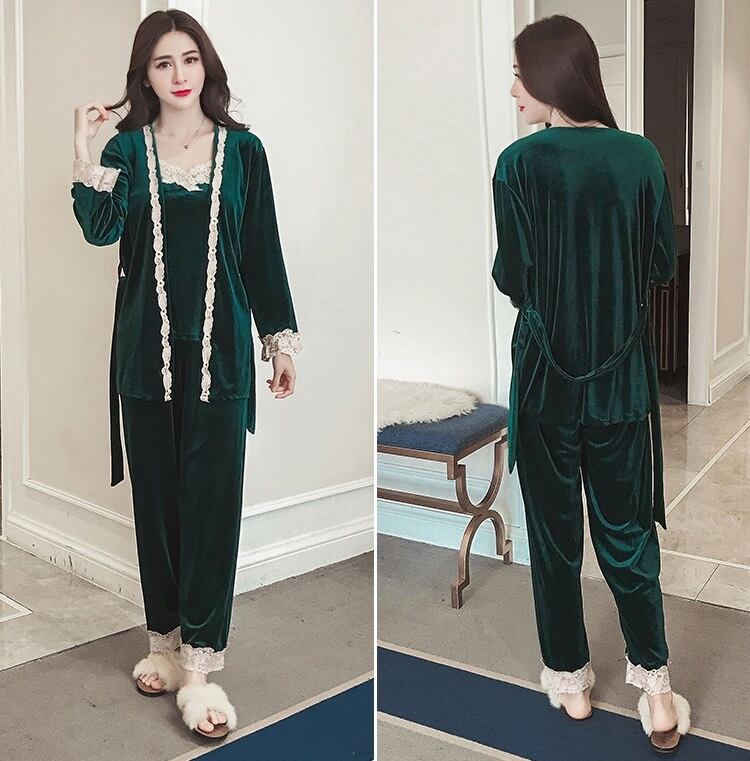パジャマ レディース ルームウェア 部屋着 寝巻き 3点セット 春 秋 長袖 きれいめ おしゃれ 上下セット パンツ レース カーディガン キャミソール ベルベット ノースリーブ 無地 青 ピンク ネイビー ワインレッド 緑 美スタイル ウエストマーク リボン 大人 セクシー デート お泊り会 シンプル 10代 20代 30代 韓国 人気 2019 新作 安い 大きいサイズ xl 2xl db0496
