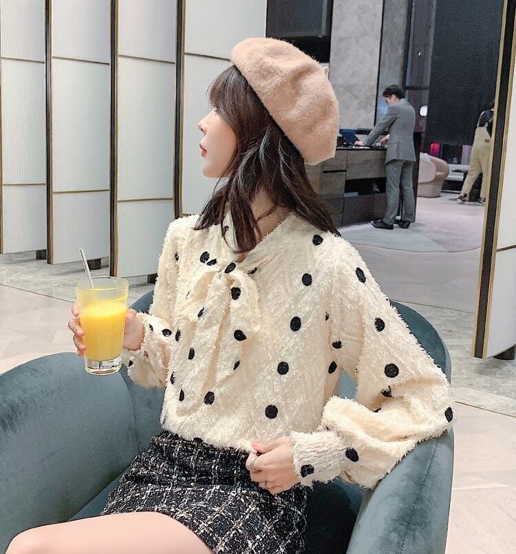 トップス レディース ブラウス シフォン シャツ ドット柄 プルオーバー リボン ボウタイ 長袖 韓国 春 秋 冬 10代 20代 30代 かわいい おしゃれ ふんわり きれいめ ブラウス コーデ 無地 アプリコット ベージュ 白 ホワイト ドット ランタンスリーブ ボリューム袖 スタンドカラー 上品 ガーリー トップス ブラウス コーデ 白シャツ 大きいサイズ xl 2xl 女子力 かわいい ママ おしゃれ デート OL 通勤 オフィス キュート 華やか db0554