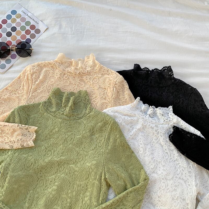 トップス レディース シャツ ブラウス レース 透け感 ハイネック 長袖 韓国 春 夏 秋 10代 20代 30代 40代 総レース 透け感 シフォン 薄め 重ね着 ブラック 黒 アプリコット ベージュ ホワイト 白 グリーン カーキ 上品 大人かわいい シンプル トップス コーデ 学生 通学 通勤 OL オフィス 休日 着まわし インナー 可愛い トップス スタイル 韓国 人気 ファッション 新作 db0613