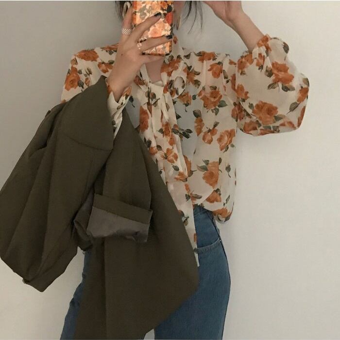 ブラウス レディース トップス シャツ 花柄 レトロ 長袖 韓国 春 夏 秋 10代 20代 30代 40代 プルオーバー Vネック フラワー 柄 ボリューム袖 ボウタイ リボン シフォン ブラック 黒 アプリコット ベージュ 大人かわいい レトロ おしゃれ きれいめ トップス コーデ 学生 通学 OL 通勤 オフィス ビジネス デート 韓国 ファッション レディース ブラウス 人気 新作 モテ カジュアル スタイル 大人可愛い ママ 普段使い 着回し 重ね着 バラ 薔薇 華やか db0648