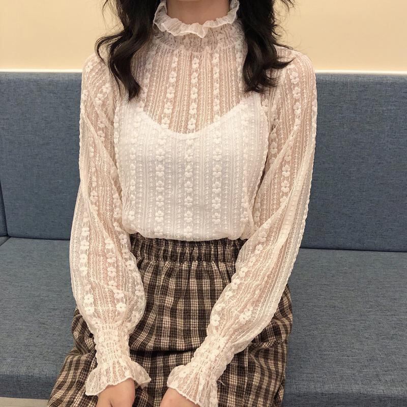 トップス レディース シャツ ブラウス レース 透け感 フレンチ レトロ かわいい 長袖 韓国 春 夏 秋 10代 20代 30代 大人可愛い シフォン シャツ ブラウス レース スタンドカラー ハイネック きれいめ トップス コーデ メッシュ ベルスリーブ ボリューム袖 ブラック 黒 ホワイト 白 アプリコット ベージュ シースルー インナー ガーリー おしゃれ 学生 通学 オフィス 通勤 OL デート 韓国 ファッション レディース ブラウス 人気 新作 モテ カジュアル スタイル 美人 db0653